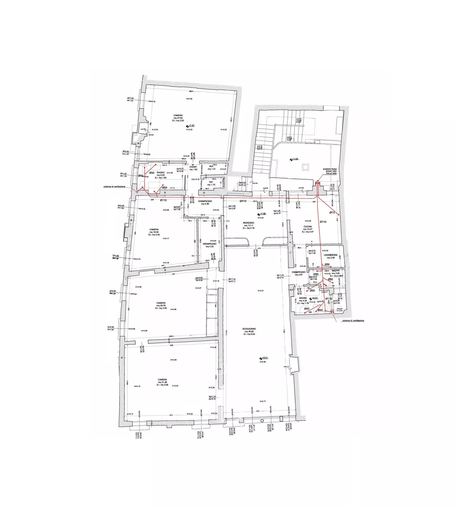 La distribuzione attuale prevede un ampio ingresso, uno scenografico soggiorno doppio di quasi 50 mq, quattro grandi camere da letto, una cucina separata, tre bagni, lavanderia, ripostigli e disimpegni funzionali. L’immobile necessita di una ristrutturazione completa, con un progetto fognario già definito. È già disponibile una stima dei lavori pari a circa 630.000 € + IVA e spese tecniche, comprensiva del rifacimento degli impianti, delle finiture, dei bagni e dell’adeguamento delle strutture esistenti.