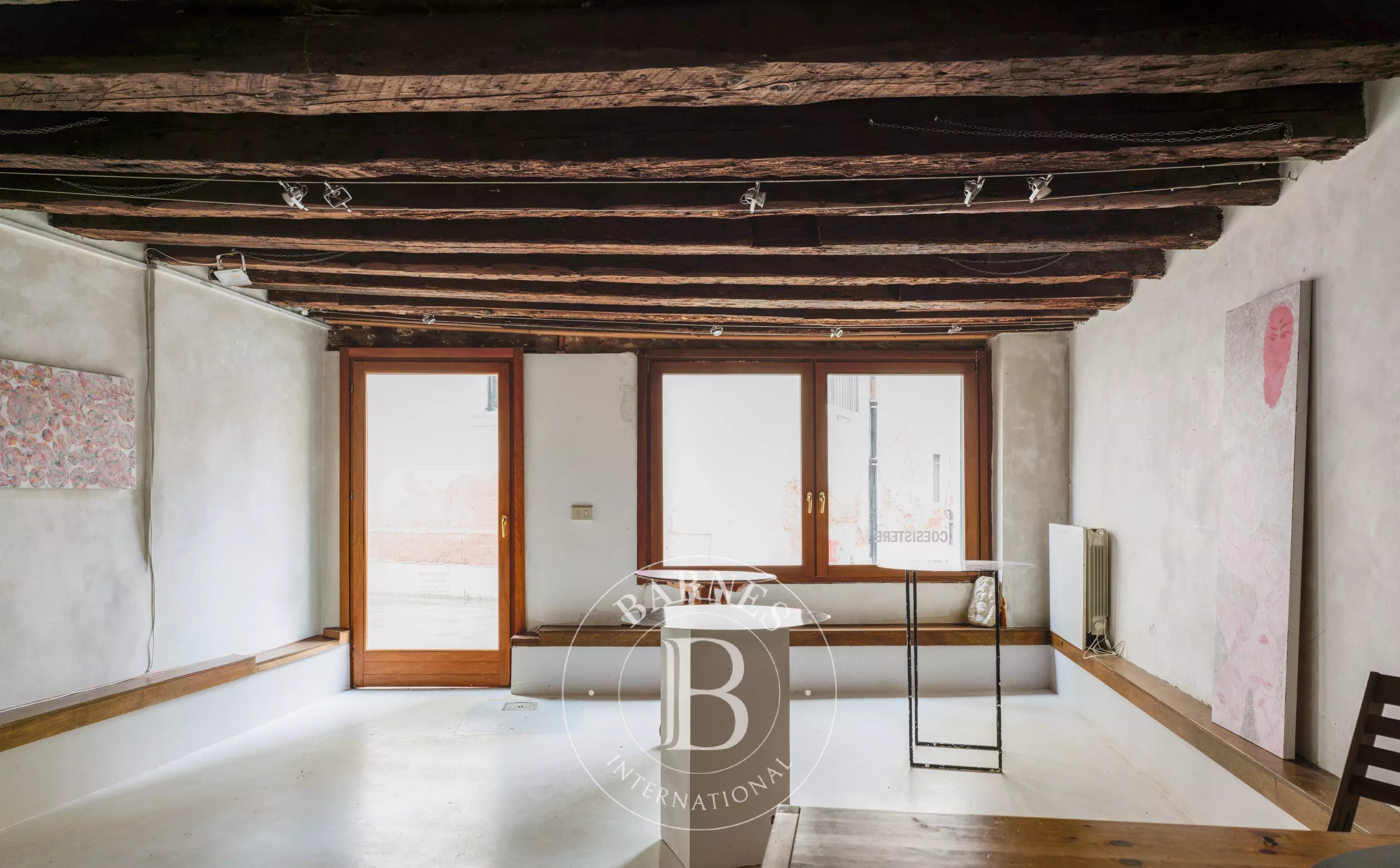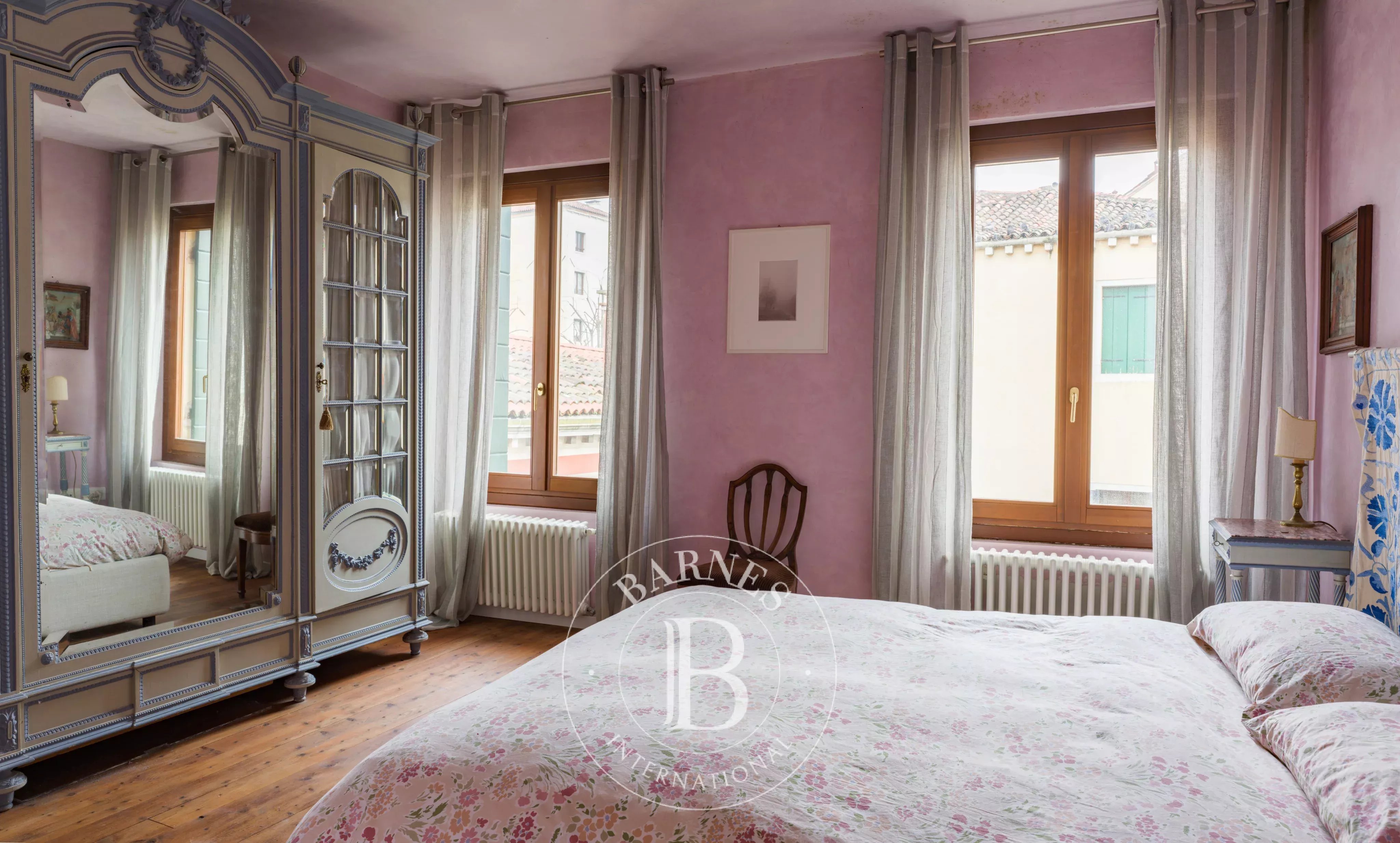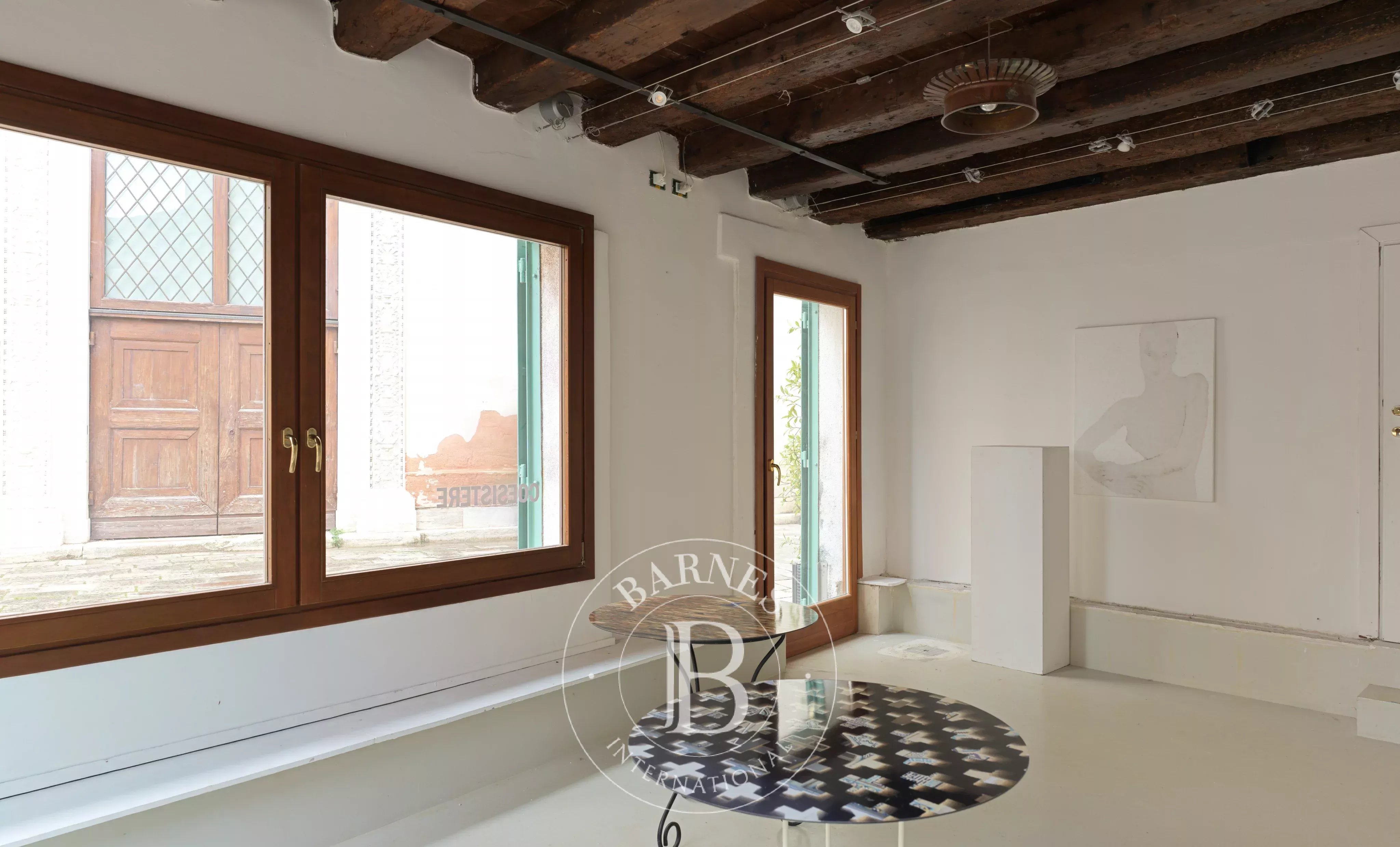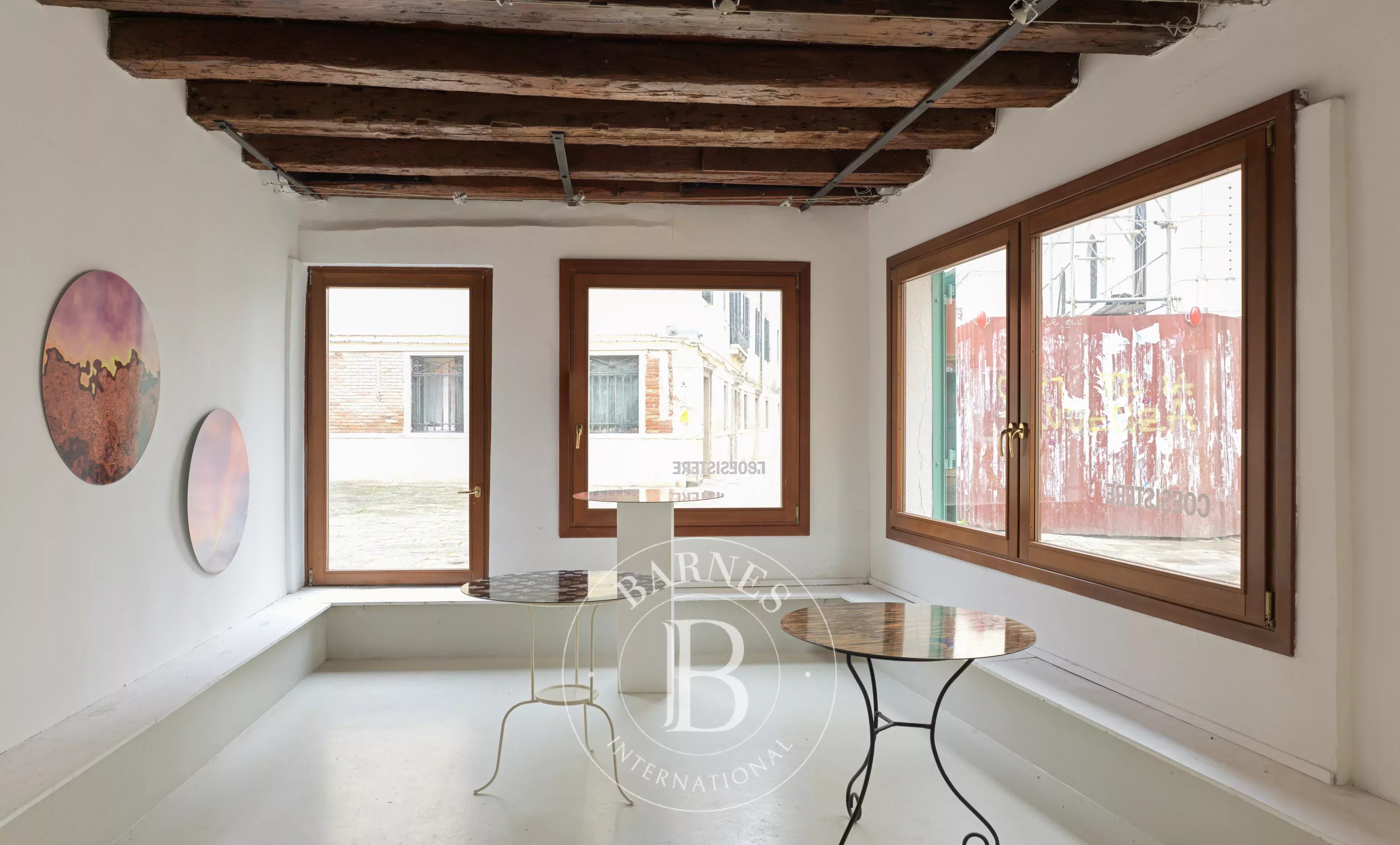All’esterno, le persiane verdi e la patina del tempo raccontano una continuità naturale con il sestiere: la pietra d’Istria, le tonalità calde del quartiere, le calli che conducono agli studi degli artisti e ai palazzi che sfiorano il Canal Grande. Il palazzetto invita a immaginare un restauro di sensibilità contemporanea, capace di celebrare la materia originaria: intonaci naturali, legno, pietra, vetro artistico, tessuti veneziani. Una palette sofisticata e luminosa.
