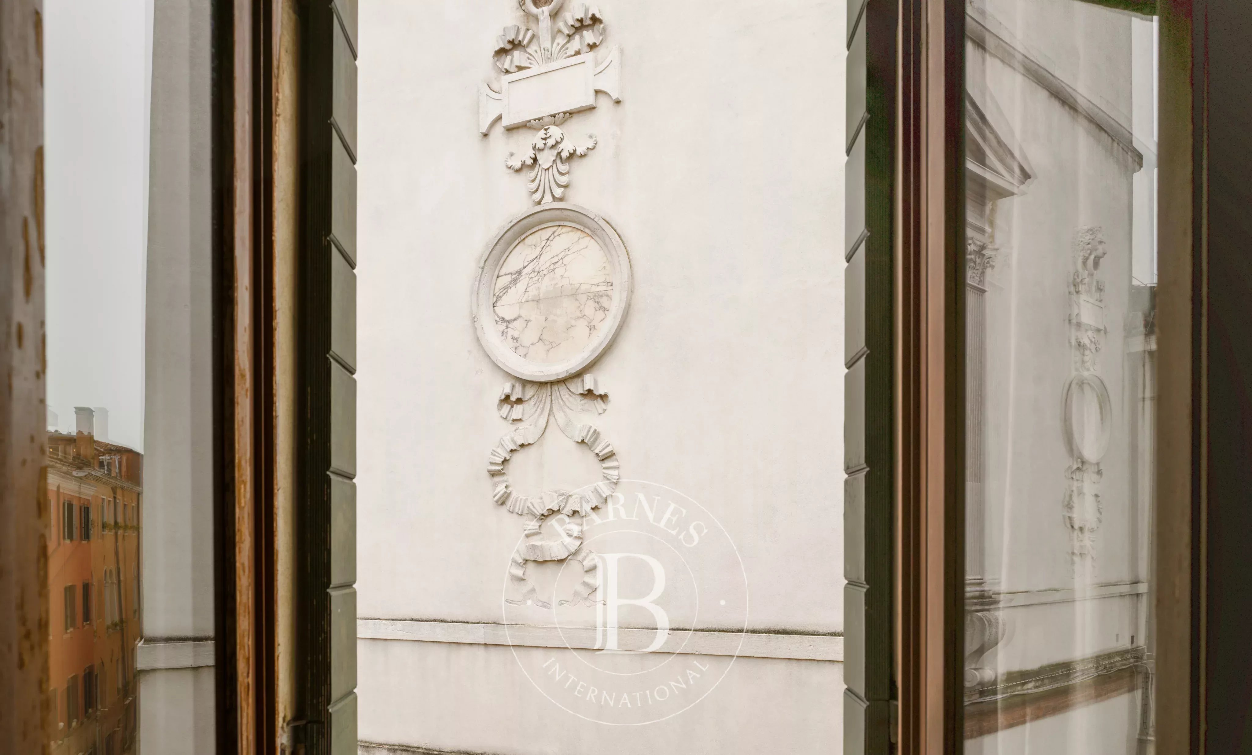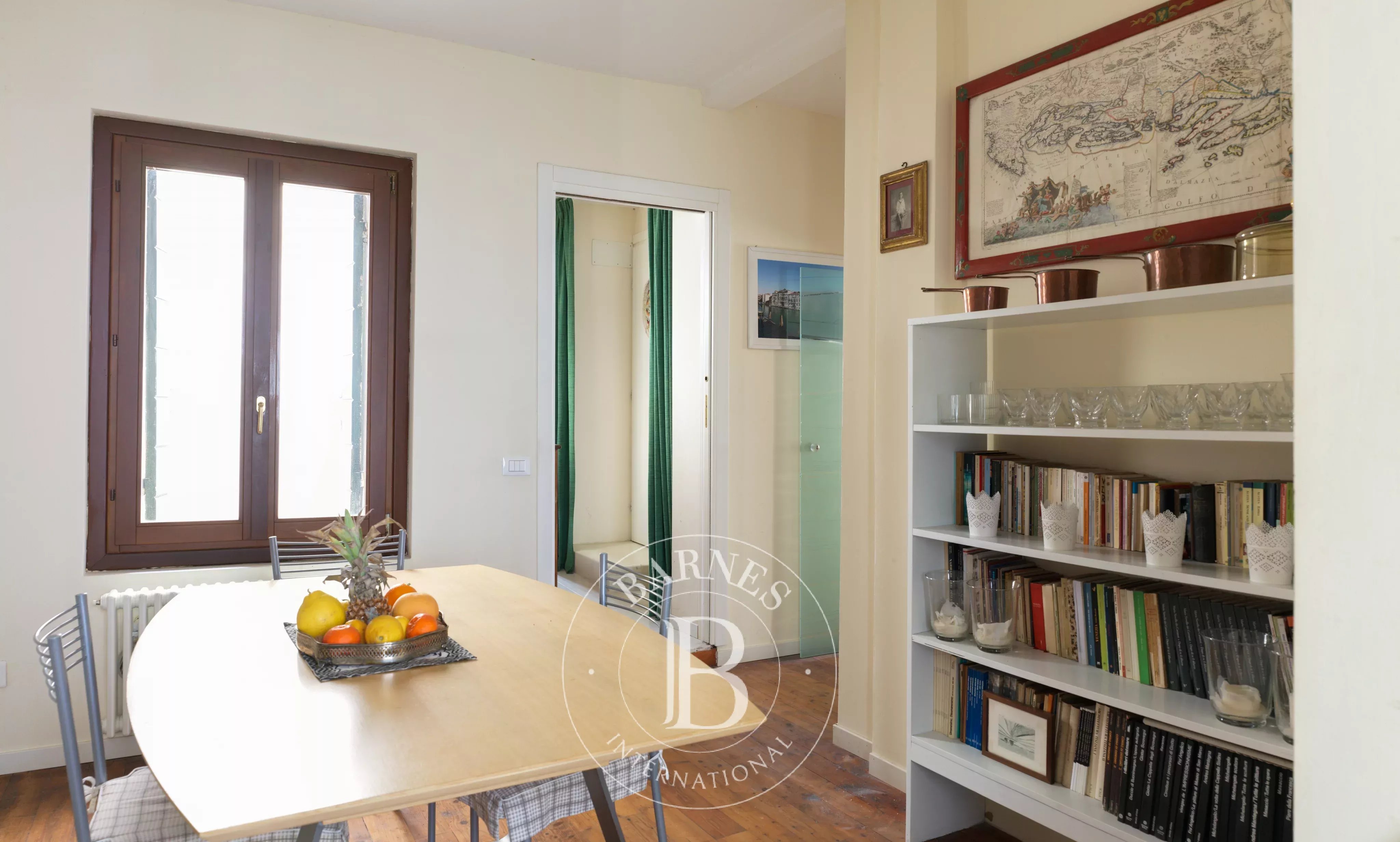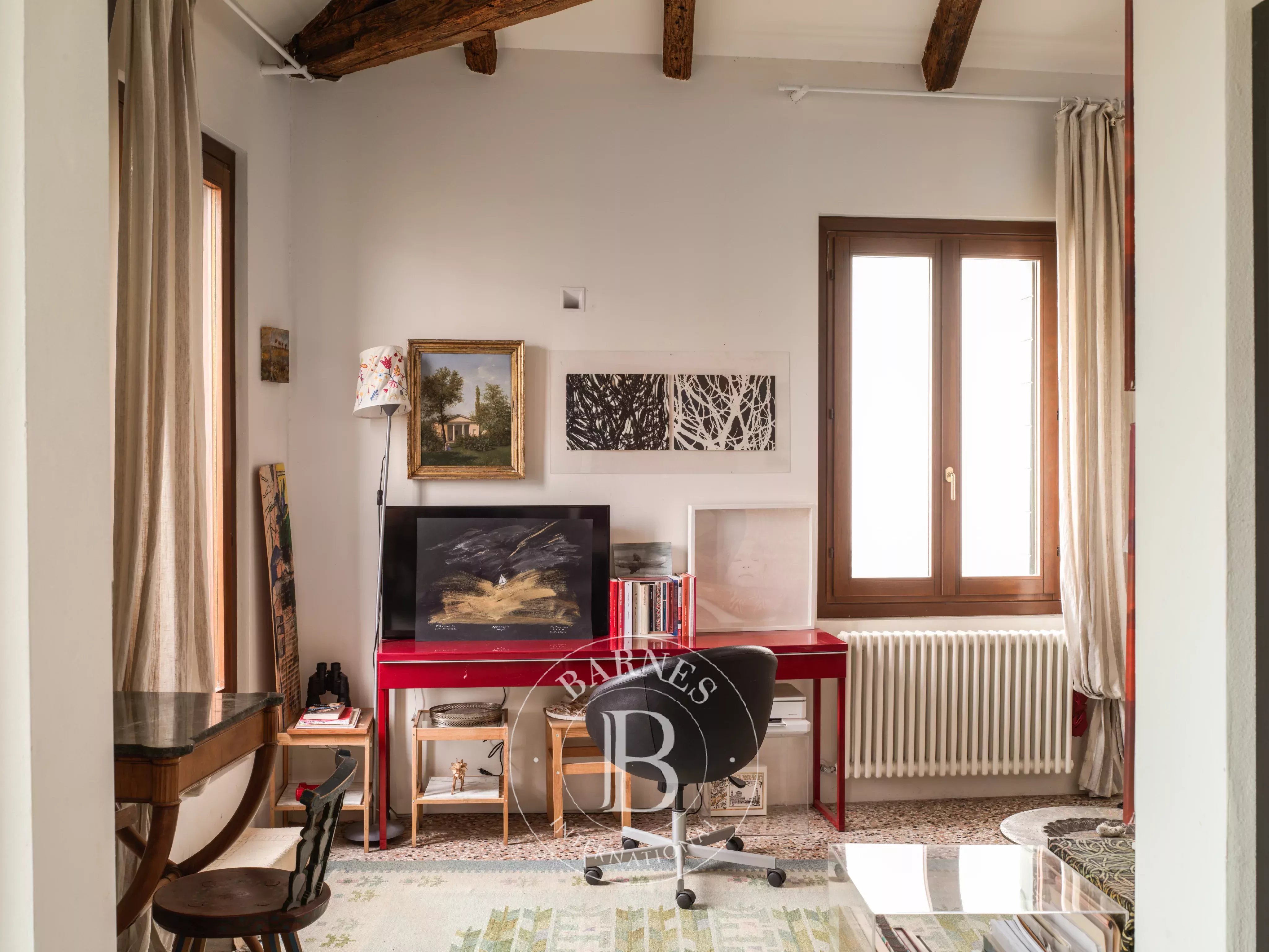 All’esterno, le persiane verdi e la patina del tempo raccontano una continuità naturale con il sestiere: la pietra d’Istria, le tonalità calde del quartiere, le calli che conducono agli studi degli artisti e ai palazzi che sfiorano il Canal Grande. Il palazzetto invita a immaginare un restauro di sensibilità contemporanea, capace di celebrare la materia originaria: intonaci naturali, legno, pietra, vetro artistico, tessuti veneziani. Una palette sofisticata e luminosa.