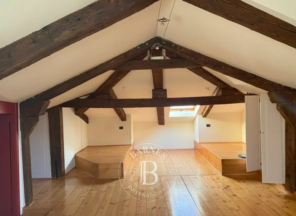 Al livello superiore si trova una mansarda con travi a vista e bagno, uno spazio versatile ideale come studio, area ospiti o zona indipendente, con accesso diretto all’altana. La mansarda può inoltre essere utilizzata in modo autonomo, grazie alla possibilità di accesso anche dalla scala principale dell’edificio.