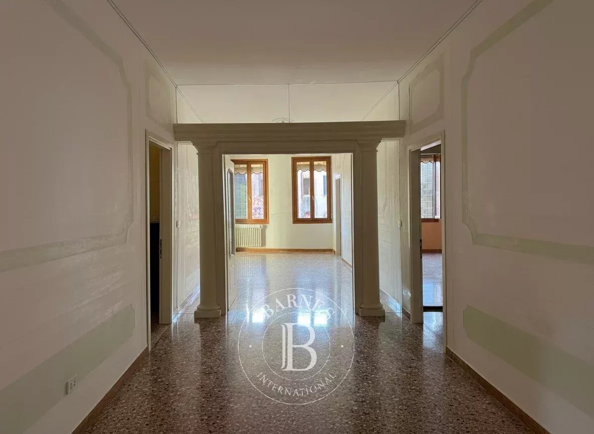 L’abitazione si sviluppa secondo la classica distribuzione veneziana, con un ampio salone centrale di circa 50 mq che organizza gli spazi della casa. Da un lato si trova la zona notte, composta da due camere da letto con bagno en suite e guardaroba; dall’altro la zona giorno, con salotto, sala da pranzo e cucina, ambienti luminosi e ben distribuiti.