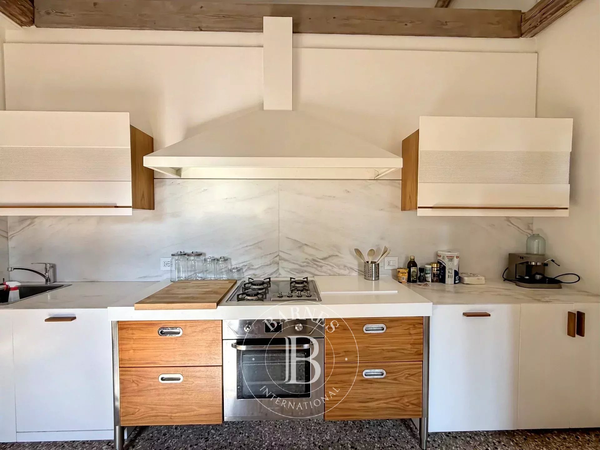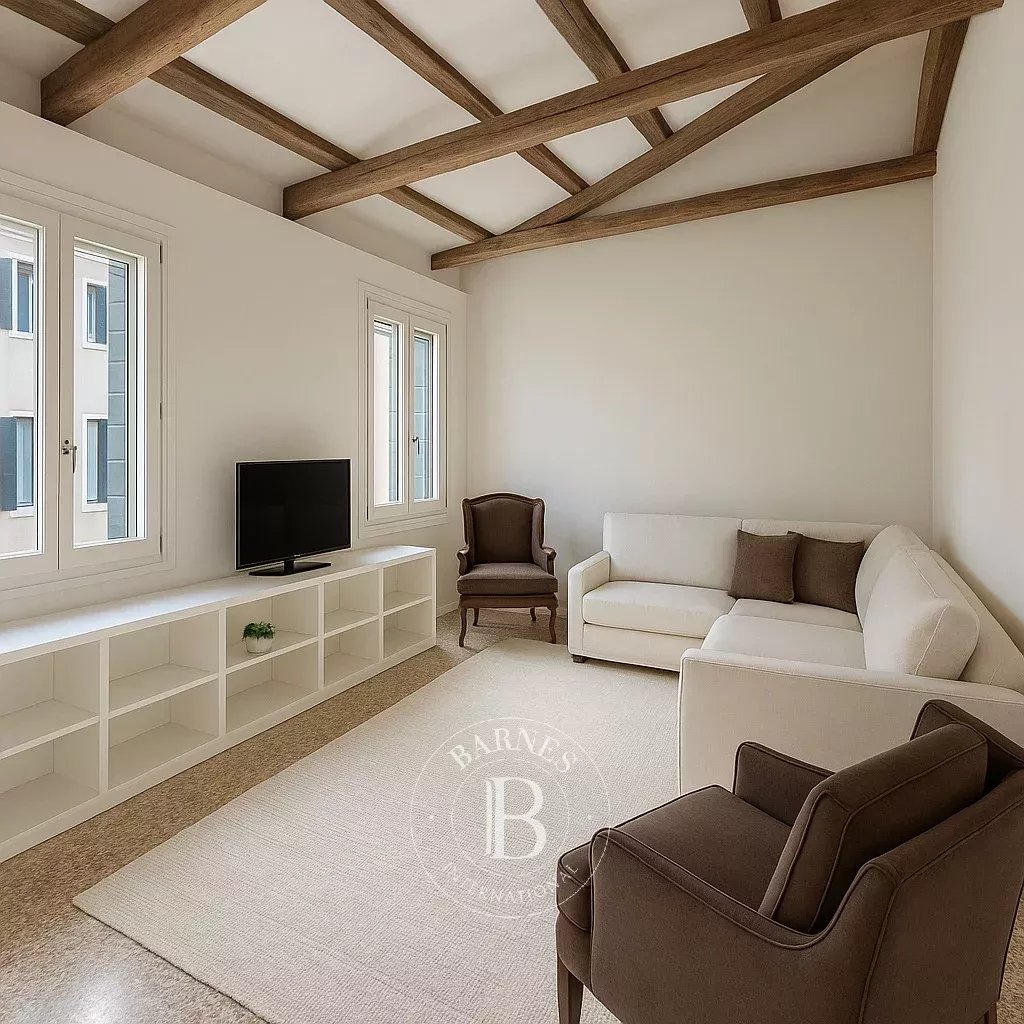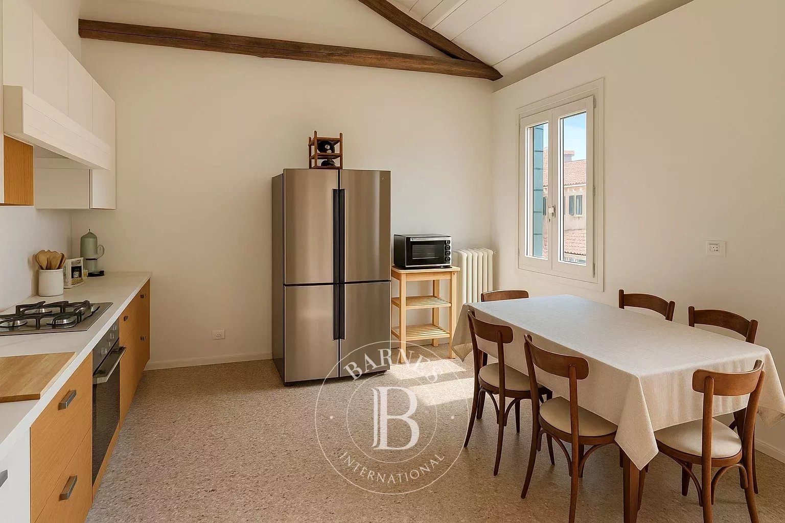 Gli ambienti sono caratterizzati da soffitti alti con travi a vista, pavimenti in terrazzo veneziano e parquet, infissi bianchi e un gusto sobrio ma curato. Il soggiorno accogliente, con doppia finestra, angolo TV e ampio divano angolare, è perfetto per momenti di relax. La cucina abitabile, con affaccio aperto sui tetti, è completamente attrezzata e dotata di ampia zona pranzo.
