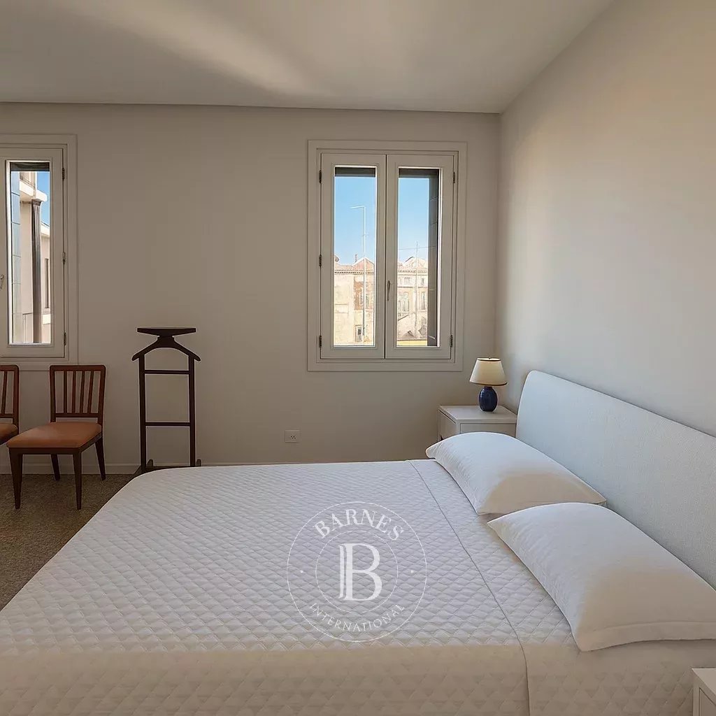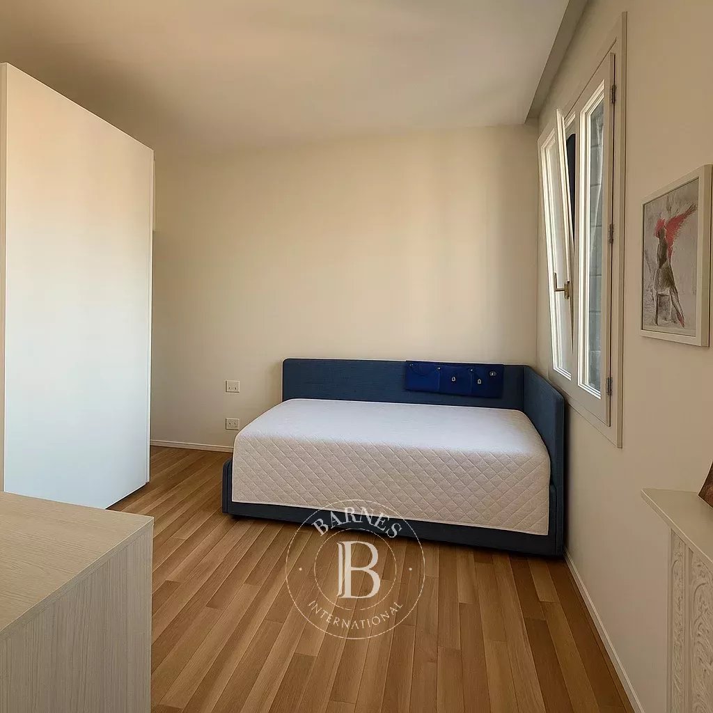 La zona notte si compone di una camera matrimoniale dalle proporzioni generose, arredata con gusto essenziale e completata da una vista libera, e una seconda camera attualmente allestita con letto singolo estendibile a matrimoniale e armadiatura su misura. I bagni, non visibili in foto, sono coerenti con lo stile elegante dell’abitazione.