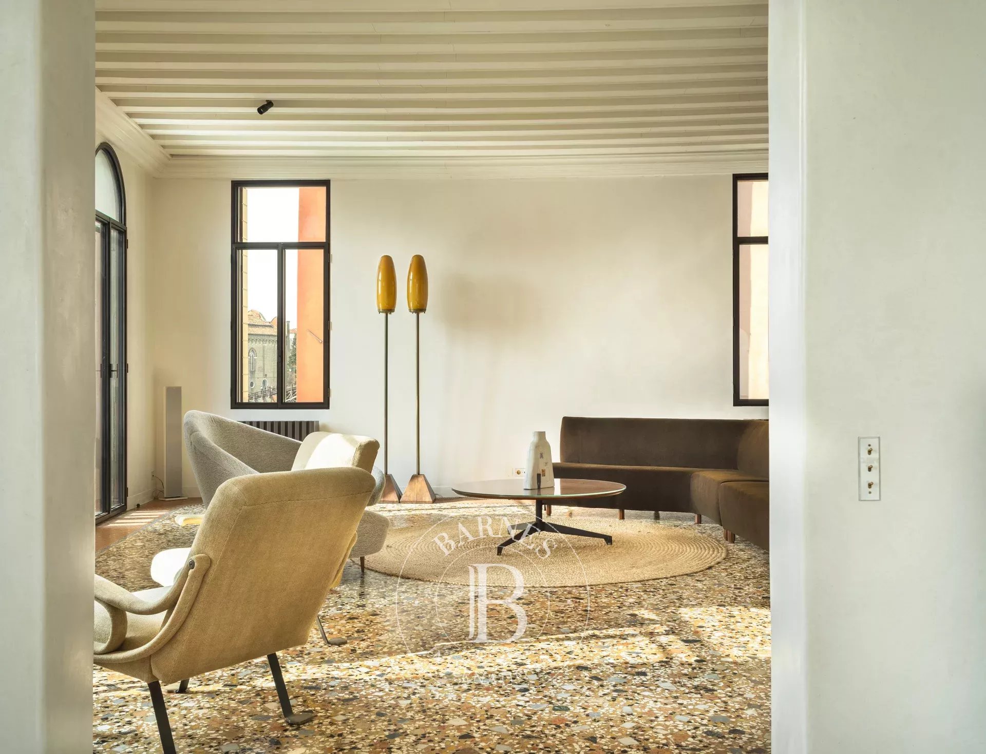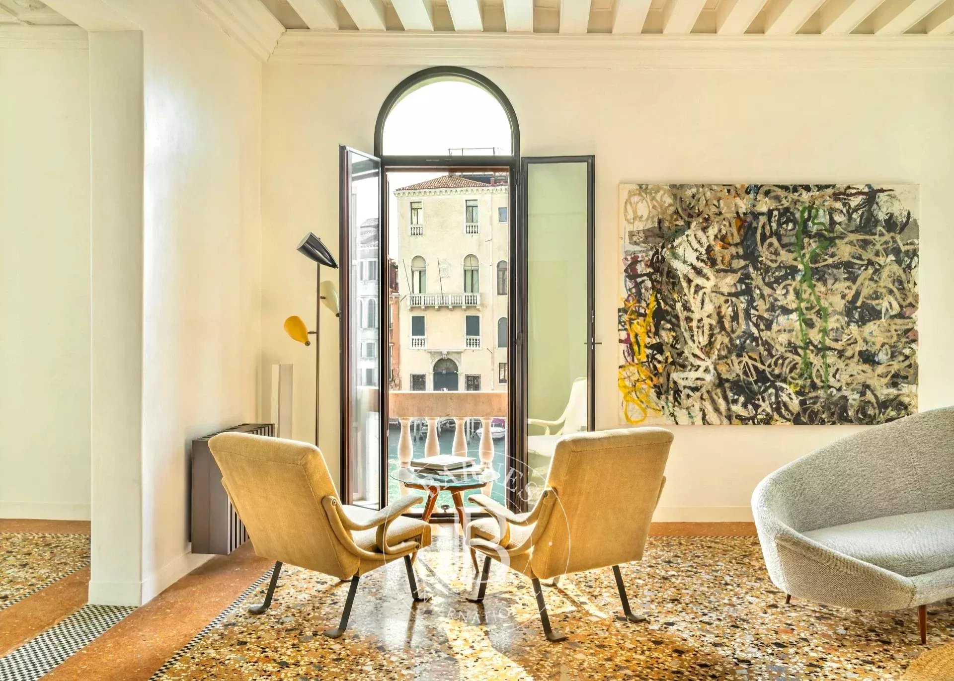 Questa raffinata residenza si trova al piano nobile di un elegante palazzetto affacciato direttamente sul Canal Grande, con viste spettacolari sulla Chiesa della Salute, sul Guggenheim e sulla laguna. È un appartamento che sorprende ad ogni angolo: la luce mutevole del Canal Grande entra dalle grandi finestre incorniciate in bronzo e si riflette sui pavimenti in terrazzo lucido, sulle pareti in marmorino e sulle cornici in gesso, creando un’atmosfera unica. Gli arredi? Una collezione iconica di design italiano degli anni ’50 e ’60 che sembra uscita da una rivista. Una volta dentro, è davvero difficile voler andar via.