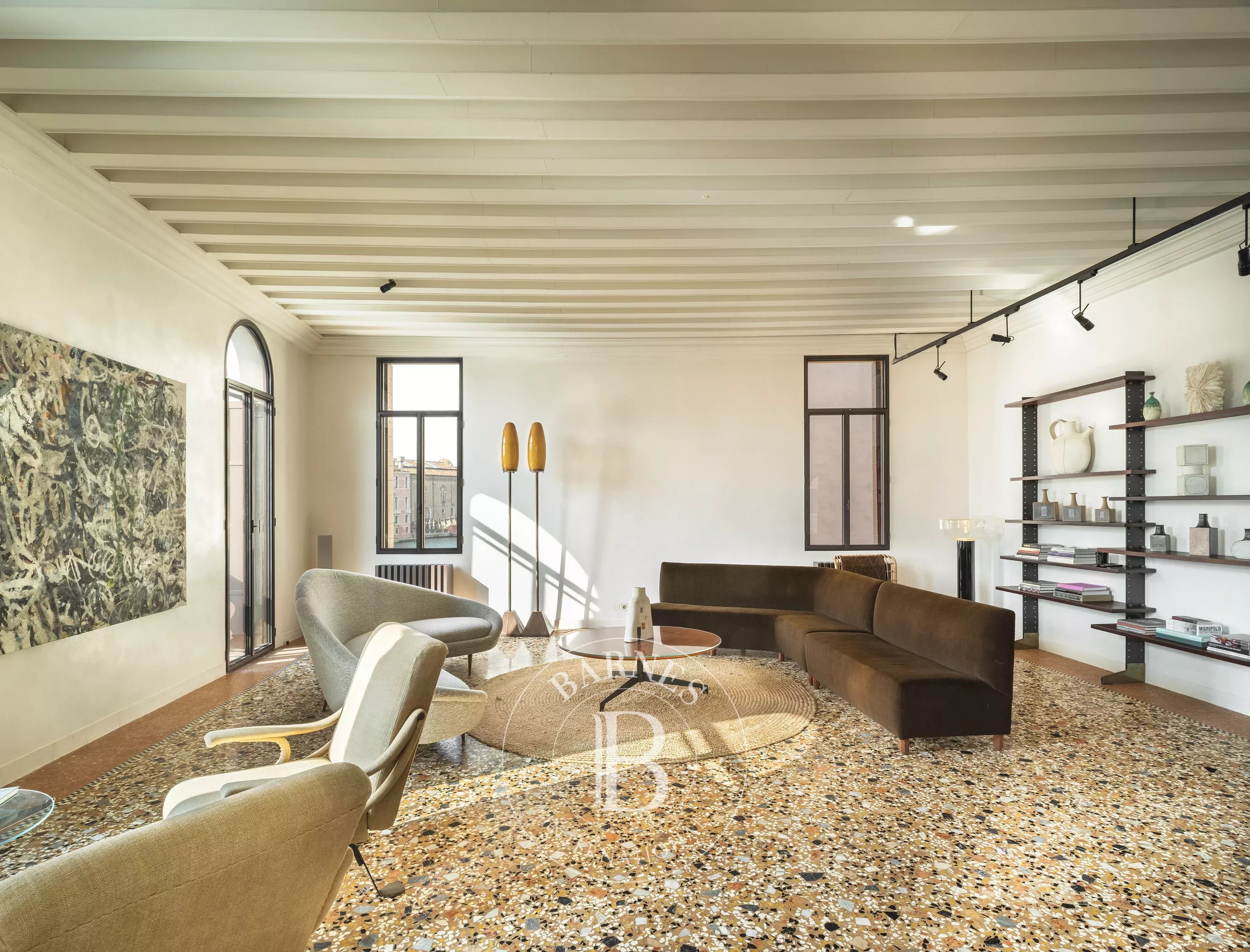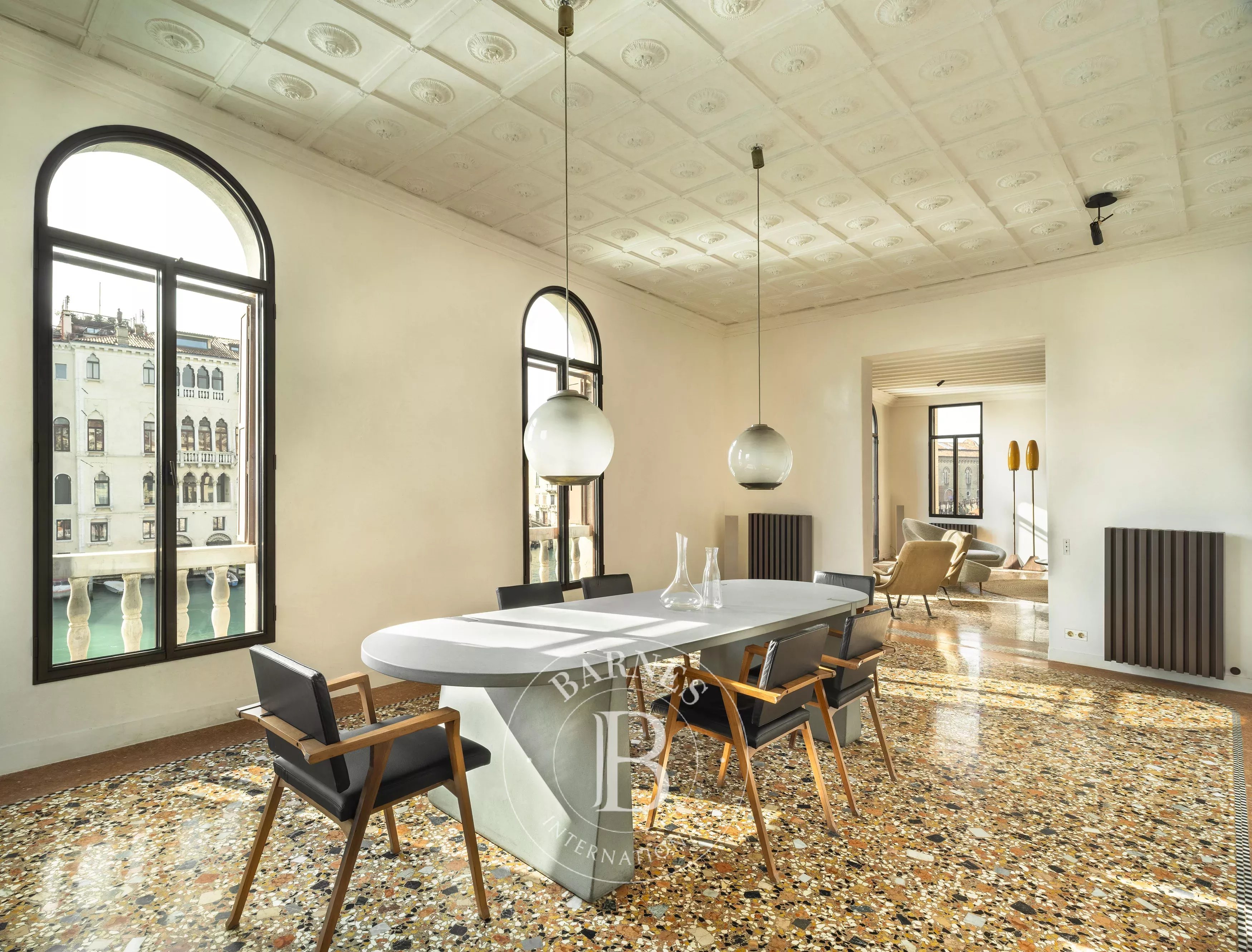Questa raffinata residenza si trova al piano nobile di un elegante palazzetto affacciato direttamente sul Canal Grande, con viste spettacolari sulla Chiesa della Salute, sul Guggenheim e sulla laguna. È un appartamento che sorprende ad ogni angolo: la luce mutevole del Canal Grande entra dalle grandi finestre incorniciate in bronzo e si riflette sui pavimenti in terrazzo lucido, sulle pareti in marmorino e sulle cornici in gesso, creando un’atmosfera unica. Gli arredi? Una collezione iconica di design italiano degli anni ’50 e ’60 che sembra uscita da una rivista. Una volta dentro, è davvero difficile voler andar via.